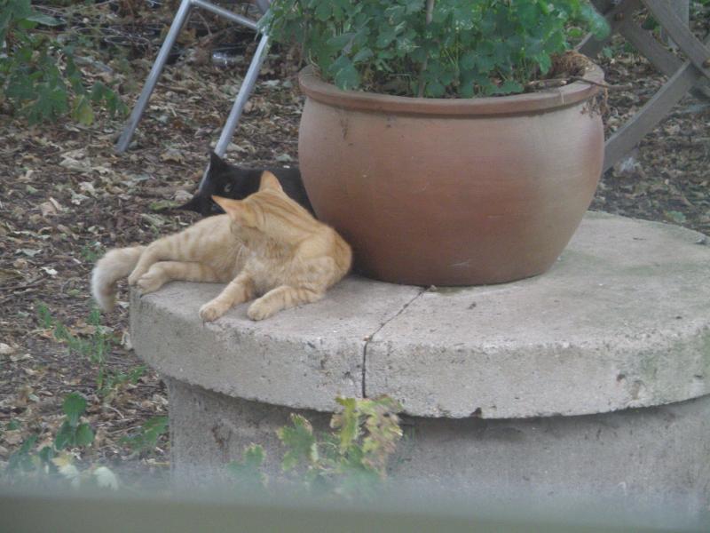 hier liegen sie im Schatten der beiden 100 jährigen Eichen gemeinsam auf dem kühlen Zementdeckel des Brunnens. Es wird friedlich ein bisschen "Pfötchenangeln" gespielt und ansonsten liegen sie und kühlen sich die Bäuche :D