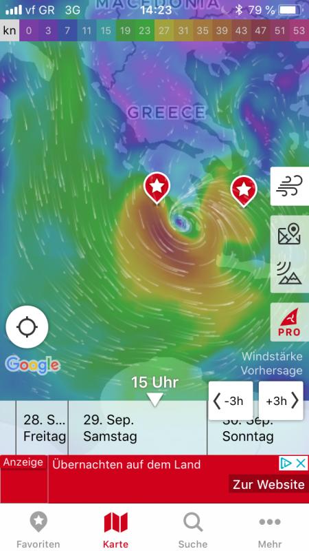 Ich wollte auf dieser Reise unter anderem auch meine eigene 'Geländegängigkeit' testen. Allerdings machte uns der Medicane (=MEDIterranean hurriCANE) Sorbas einen Strich durch die Rechnung. Wegen ihm wurde fast der gesamte Fährverkehr in der Ägäis für zwei Tage eingestellt, weshalb wir die Inseln, die wir besuchen wollten, nicht erreichen konnten. Wir wichen mit einem Mietwagen auf die Peloponnes aus, aber leider folgte uns Sorbas dorthin. Angehängter Sreenshot von Windfinder zeigt die Vorhersage am 29.9. um 15 h; der linke rote Pfeil zeigt unseren Standort. Bei Windstärken von 10 bis zeitweise 12 und heftigem Regen war es nichts mit Wandern. Unterm Strich blieben uns nur ein paar Tage mit schönem Wetter. So kamen wir auch kaum zum Laufen.
