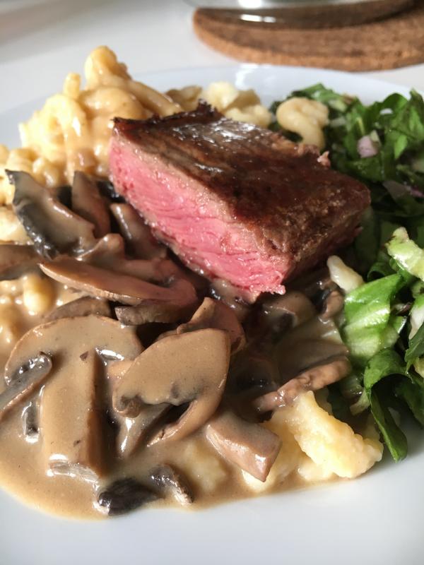 Zum Abendessen Steak, Pilzrahm, Spätzle und der erste Radicchio aus dem Hochbeet