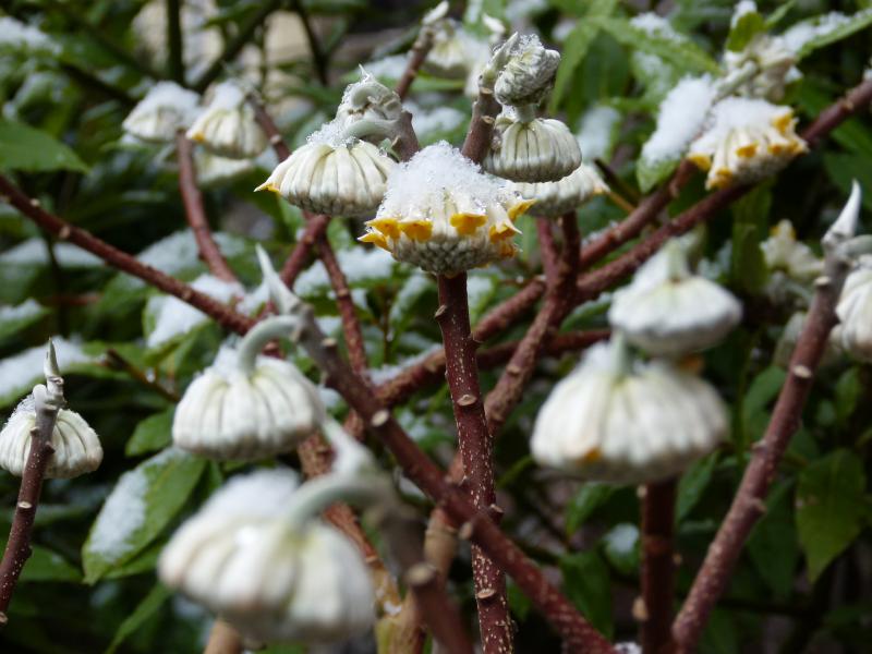 Edgeworthia chrysantha mit Schneemützchen- sogar bei dieser Temperatur kann man den Duft wahrnehmen!