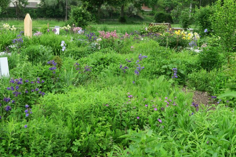 Auf diesem Mai-Foto sieht man man einen Auschnitt aus einem Garten mit wiesenartigem Charakter, der aber schon recht gut eingewachsen ist...