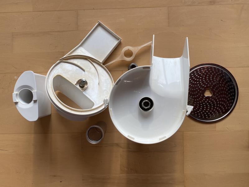 Die Maschine ist einfach fürs Teigkneten mittlerer bis grosser Mengen konstruiert. Das ist ihre Stärke. Ist ja auch logisch, vor Jahrzehnten war das die häufigste schwerste Arbeit, das sollte sie elektrisch machen, da war der Bedarf am grössten. Macht sie auch heute noch gut und sie verdient eine Beschreibung in diesem Thread, das ist ontopic und passt. Die Zusatzgeräte haben dagegen viel zu viele Einzelteile. Das Schnitzelwerk besteht aus sieben Teilen, alles muss ineinandergesteckt und separat gereinigt werden. Wehe, man verliert ein Teil... Der Auswurf des Schnitzelwerks ist fehlkonstruiert aufgrund der unpraktischen Gehäusekonstruktion der Maschine selbst, es bleibt viel drin und verstopft weil es viel zu horizontal lang ist, anders als bei den anderen MUMs. Die Leistung des Schnitzelwerks ist schlecht, auch wegen niedriger Drehzahl und unintelligenter Raspelscheibenführung, das schaffen sehr viele andere Maschinen besser. Verluste bei kleinen Mengen. Die anderen Punkte passen. Du hast dir die Bonuszahlung von Bosch verdient :-)