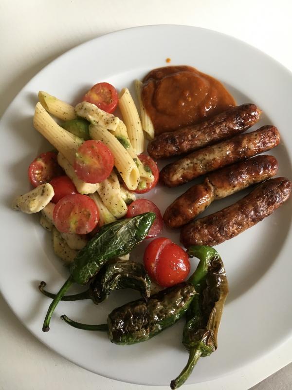 Grillerei mit Nudelsalat, Pimentos und Tomatenchutney