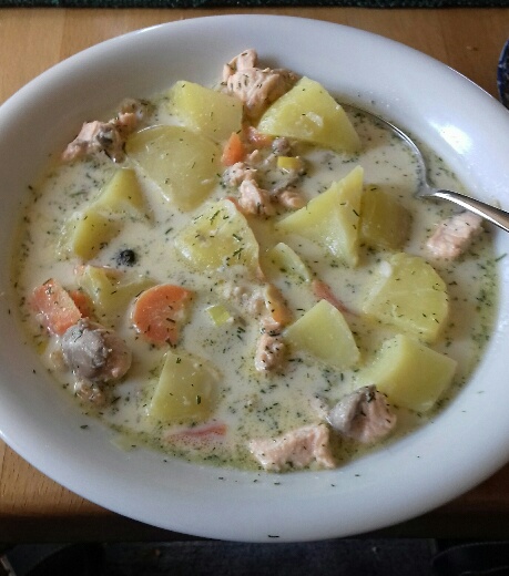 Hier gab es heute Mittag Lachssuppe (Kartoffeln, Möhre, Frühlingszwiebeln, Lachsfilet, Krabben, Sahne, Weißwein, Dill, Lorbeerblatt, Pimentkörner, einen Hauch Knoblauch).