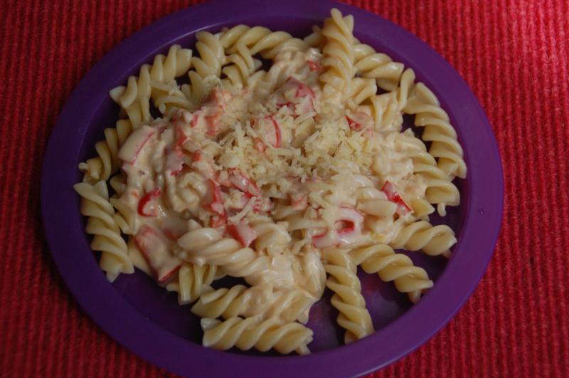 Spirellen mit Knoblauchsahnesoße (mit etwas Paprika) und Gouda