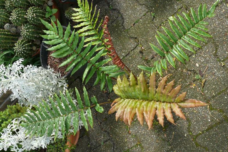 Sogar ich habe was gekauft. 3 Mitleidspflanzen, weil einer der Sukkulentenjungs aus Witten seinen Hof aufgeben und 200 qm Steingarten ausbuddeln und anbieten musste. Entweder war das Frank Michael oder Jürgen Schmidt, der Lockige, der einen immer per Handschlag begrüßte. 3 mal Delosperma, noch nicht blühend, da nicht im Gewächshaus vorgetrieben. Dann beim Farnstand einen Blechnum chilense in der Rot austreibenden Sorte. Junebug, das prospektive Farnmodel, hat ja auch dasselbe gekauft. Beim Nachhausekommen war unsere brasilianische Freundin Ursula zugegen - ja, die Chilenen sind härter als die Brasilianer, sagte sie.