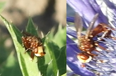 Ich konnte leider kein besseres Foto machen. Es scheint eine rötliche Schwebfliege mit weißer Maske zu sein. Sieht auf jeden Fall interessant aus.