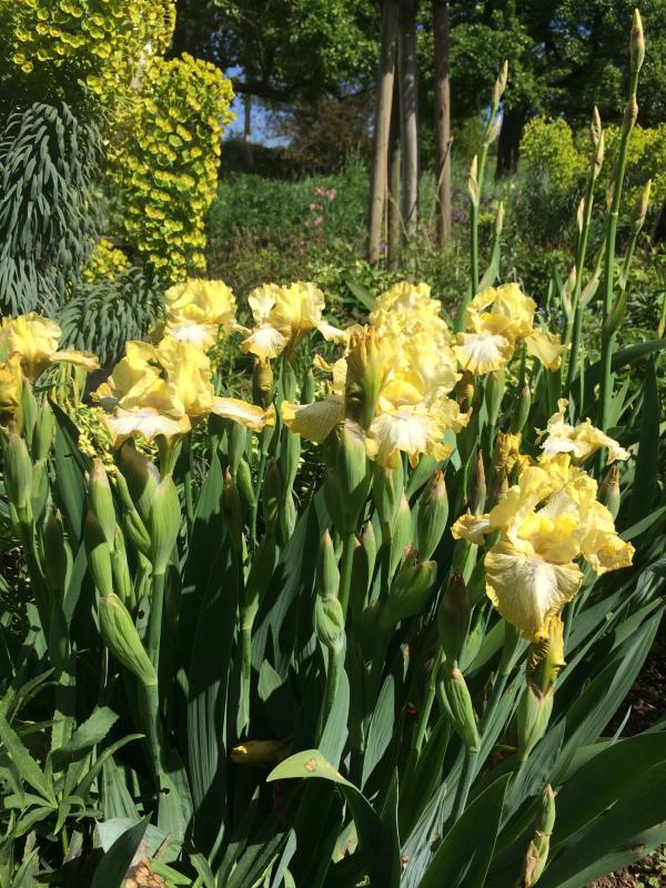 Iris hellgelb und halbhoch klingt perfekt, solche (Iris flavescens?) habe ich in diversen Gärten hier gesehen und fand sie sehr apart.