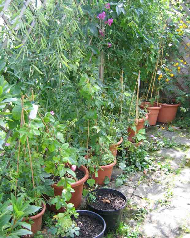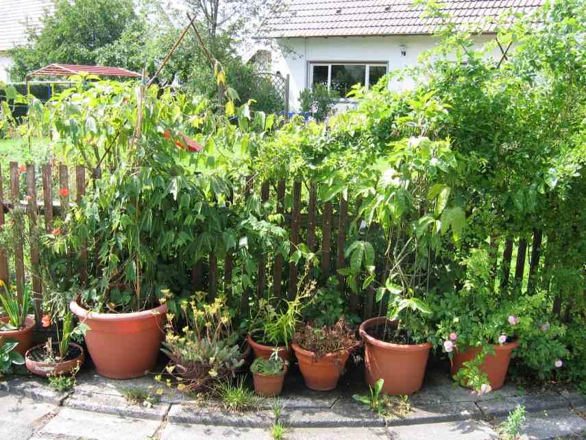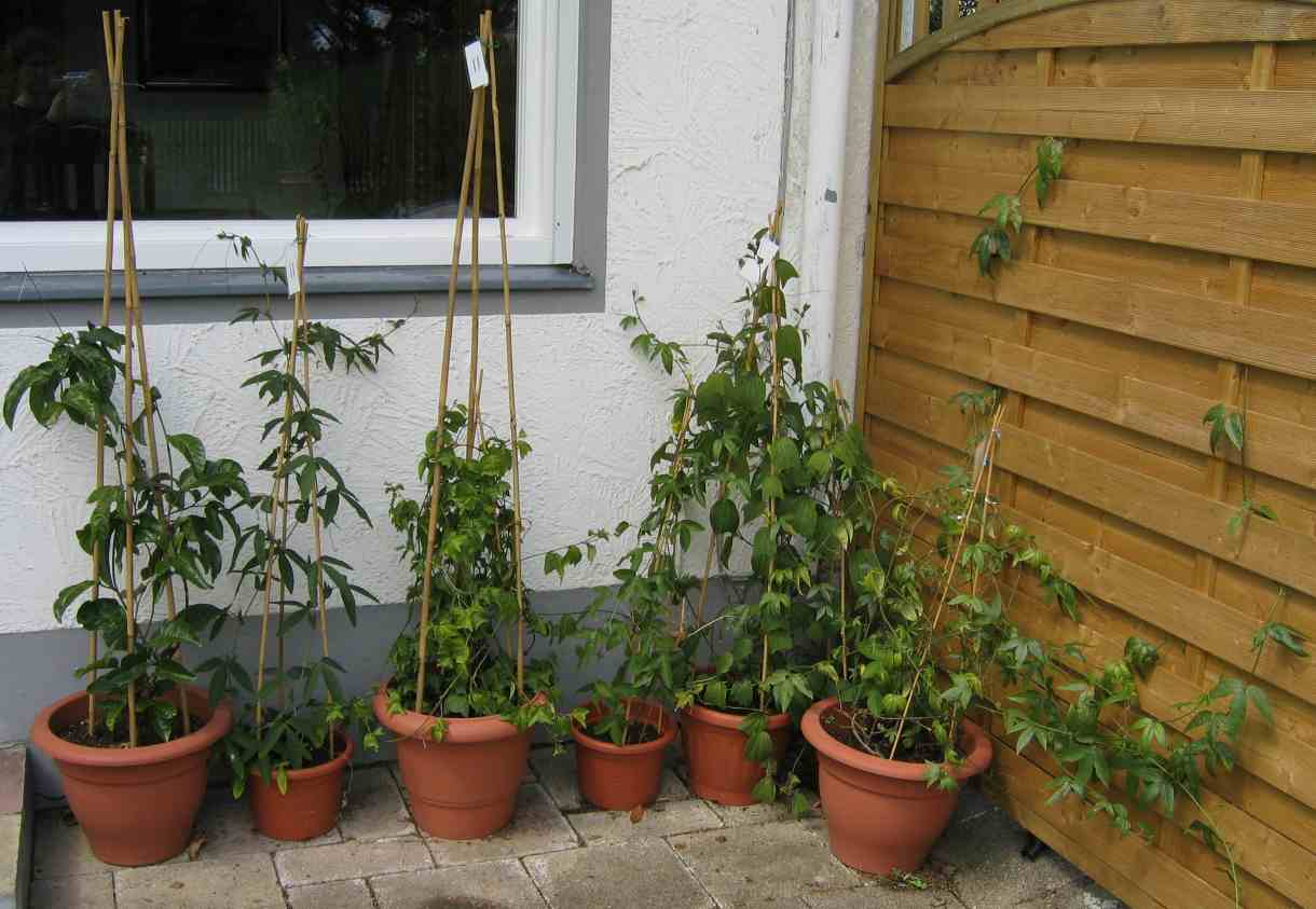 und um es mal zu dokumentieren wie das Leben mit 43 Passis aussieht...wobei eine 7er Fraktion noch auf dem Balkon steht. Die muesst Ihr Euch jetzt denken....Was wohl unschwer zu erkennen ist... es sind wenig Blueten, aber viel gruen. Doch sind die meisten Jungpassis, da mich erst letztes Jahr der Hafer gestochen hat. LMP3 zeigt aber denn zwei ausgewachsene Exemplare. Rechts eine ziemlich alte Edulis - hat noch nie geblueht, aber bitte, man gewoehnt sich ja an vieles. Ist uebrigens ein Saemling. Und links die Sunburst (