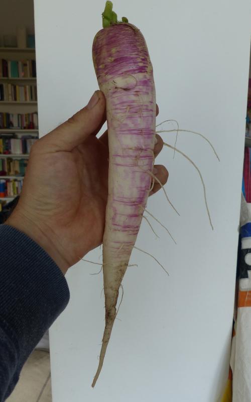Mittlerweile bin ich in der Ernte der Rettiche im Folientunnel. Der Bamberger Rettich hat sich im von einem Freund vermehrten Saatgut wohl etwas verkreuzt, schmeckt aber nach wie vor großartig und dieser hier hatte nicht einen einzigen Wurmgang. Zustand nach 2 Monaten, das finde ich ordentlich!
