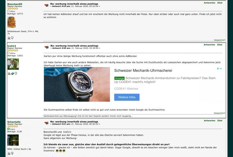 Etwas hat sich verändert beim Aufruf von Garten-pur übers Handy: es legt sich beim Aufruf einer neuen Seite oder bei der Antwort auf ein Post Werbung vor das Fenster. Man kann das wegklicken, aber wenn man zu grobmotorisch agiert, landet man schon mal auf der beworbenen Seite.