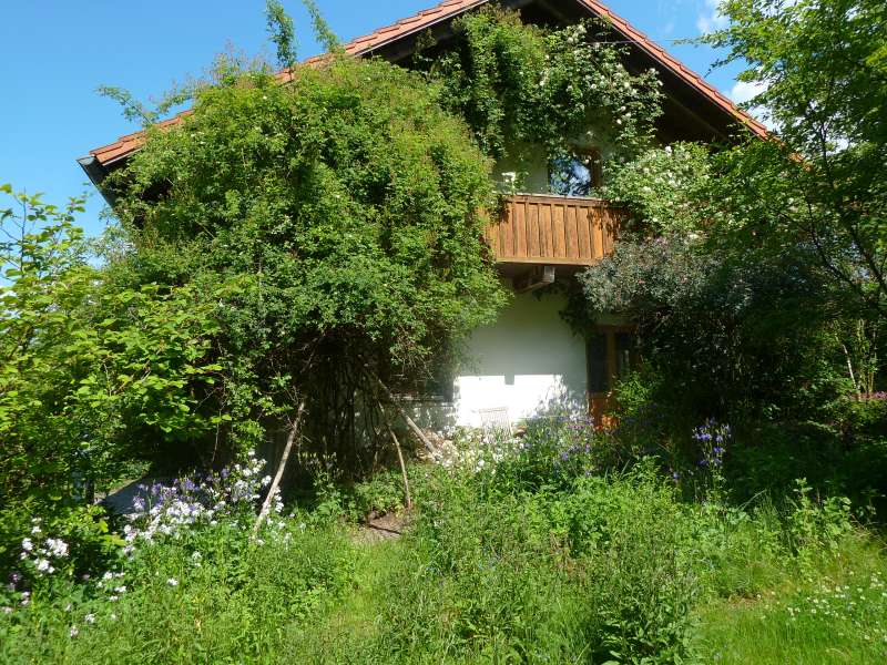 MAC ist die Rose rechts am Balkon bis unter den First (links Rambling Rector)