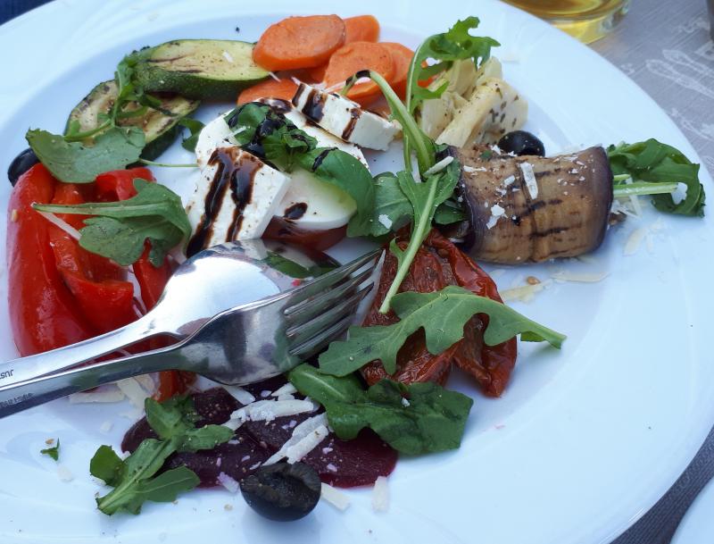 Fenchel- und Wildsaubratwurst, Couscous mit Tomate und Gurke, dünne Ripperl, Tomatemozzarella,