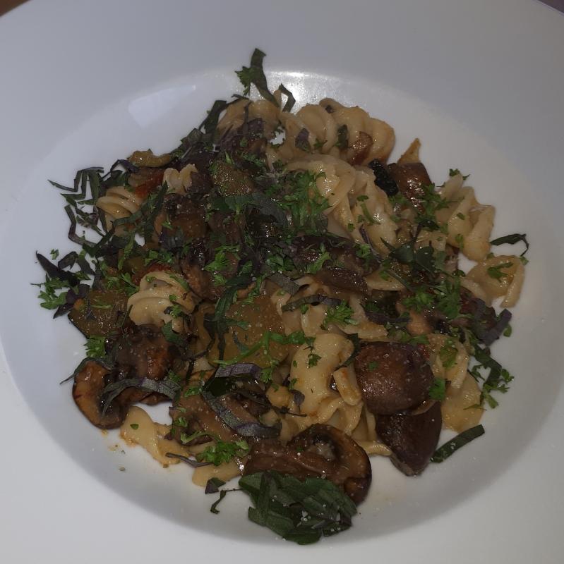 Spirelli mit Zzcchini, Champignons, Tomaten und Parmesan, Blattsalate