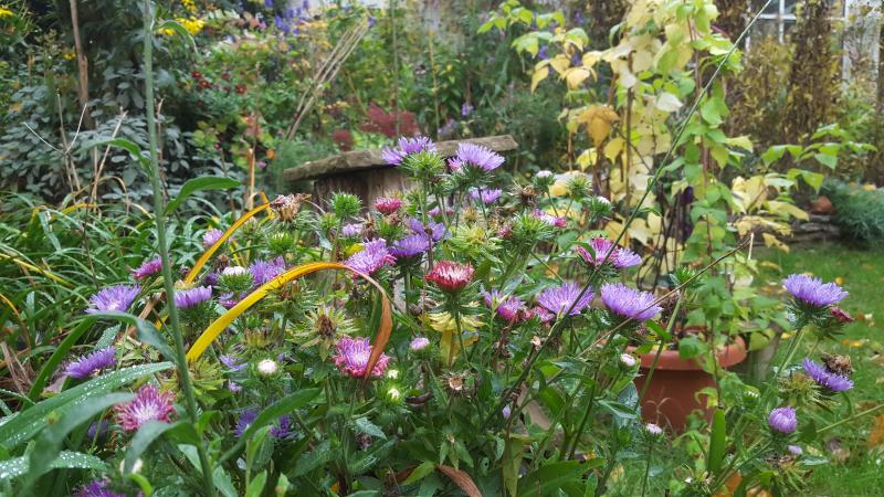 Außerdem blühen noch ein riesiger A.novi-belgii-Sämling und die zwar heftig wuchernden, aber sehr geliebten Aster tradescantii.