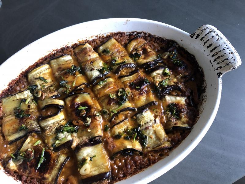 Die Auberginen werden längs in Streifen geschnitten und im Ofen mit etwas Öl, Salz und Pfeffer gegart.