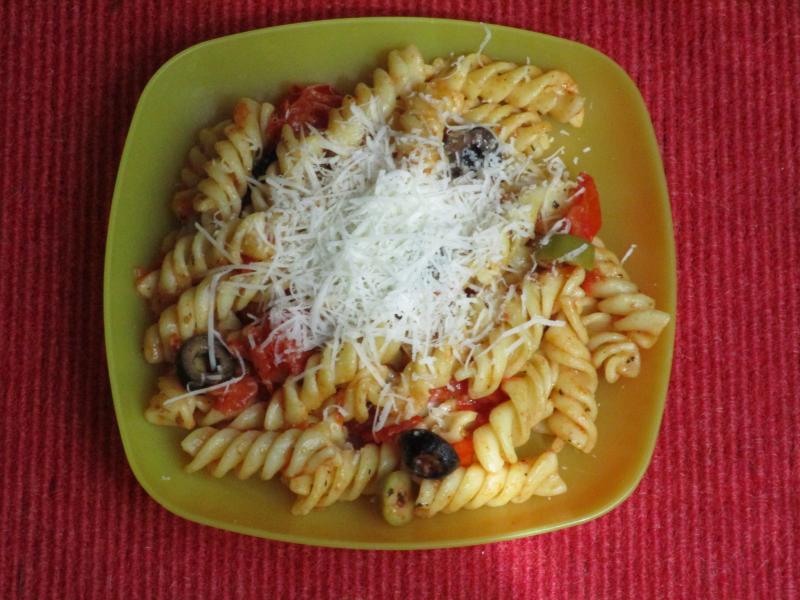 Heute gab es gebratene Spirelli mit Tomaten und Kräuteroliven.