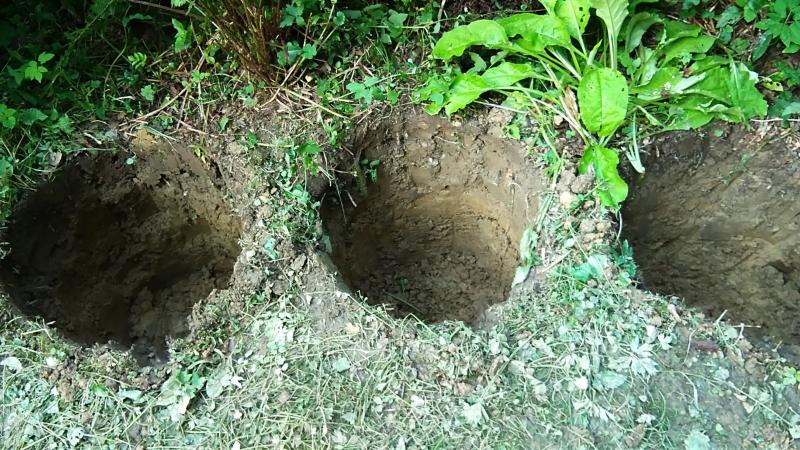 Drei Löcher in den satten Lehm gegraben wo bei stärkerem Regen Wasser steht.