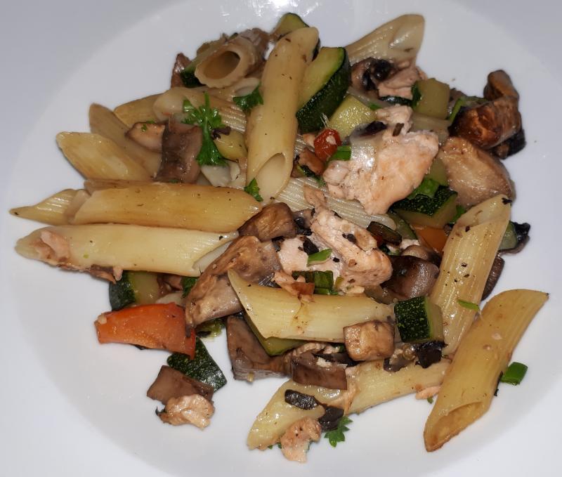 Penne mit Champignons, Zucchini, Paprika und Lachs