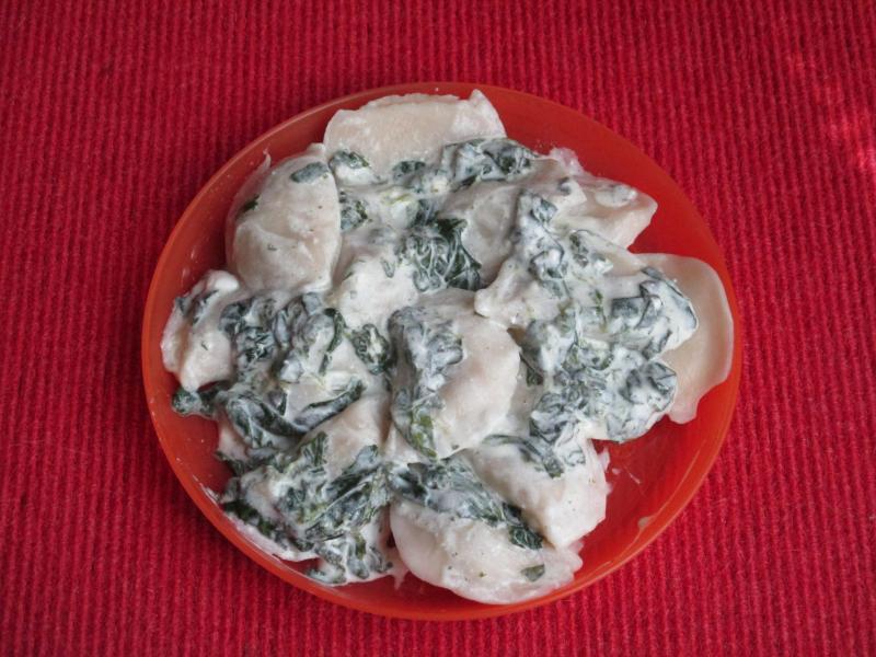 Vareniki (Kartoffel-Pilz-Füllung) mit Spinatsoße