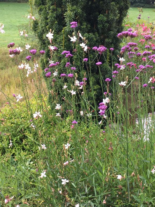 Im Hintergrund kannst du noch Verbena bonariensis und Gaura dazwischen säen oder pflanzen. Die lockern die Pflanzung vor der Hecke schön auf.