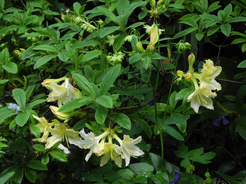 Auch etwas Immergrünes könnte passen.Auch die Azalea daviesii mit zartgelben duftenden Blüten vor Rosa könnte ich mir gut vorstellen.