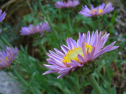 *echte Alpenastern halten ewig und sehen so aus......Hat jemand einen tipp für den Namen der "Sommerastern" Staude? Ich hab nämlich auch schon einen Ableger gekriegt. die Blüten sind so groß wie große Herbstastern Blüten, sie haben ein gelbes Auge und außenrum einen kurzen dicken Kranz von pink oder violetten "Blütenblättern". sie sind ca. 25 cm hoch und wirken viel weniger verholzt als Herbstastern. Halten in der Vase sehr lang und wirken so ein bisschen 70er Jahre Prilbumen-Mäßig in ihrer Fröhlichkeit.