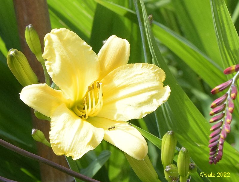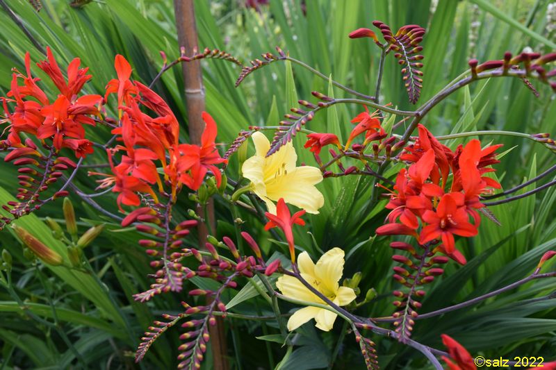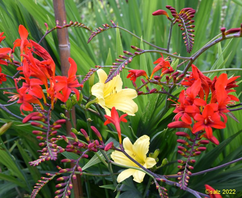 Wenn die Taglilie Dein eigentliches Motiv ist und die Crocosmia nur schmückendes Beiwerk, dann solltest Du die Bühne entsprechend vorbereiten, also nix vor der Taglilienblüte und insgesamt weniger Crocosmia-Durcheinander - wie marygold schon empfohlen hat. Bei der Bildgestaltung wäre es besser, wenn die Crocosmiablüten - wie im Beispiel links - nicht angeschnitten wären. Entweder kräftig beschneiden oder ganz lassen, ein bisschen angeknabbert finde ich persönlich immer störend.
