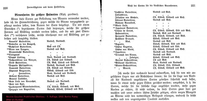 In der Anbautabelle von Gauchers Spalierbuch steht die Gute Luise ebenfalls mit Nordlagen-Eignung. Die gesamte Tabelle (aus der 4. Auflage des "Praktischen Obstbaus" von 1912) habe ich beigefügt - zur Anregung, nicht als 1:1-Anleitung! - Übrigens empfiehlt auch Nicolas Gaucher für solche Lagen, ähnlich wie oben schon Ayamo, nur Sommer- und Herbstsorten, weil sie länger ausreifen können.