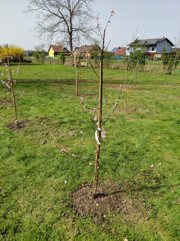 Der eine Pfirsich musste etwas enger auf den Beerenstreifen gepflanzt werden, da auf der Wiese kein Platz mehr war und ich den neu austreibenden alten Pfirsich nicht wieder wegreißen wollte.