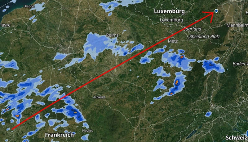 Draußen 27°C, drinnen 23°C, die Sonne brennt mal wieder von einem fast wolkenlosen Himmel. Am Wochenende sind bis zu 32°C vorhergesagt, da muten die 21°C für morgen wie ein Witz an. Die Regenvorhersagen sind ebenso ein Witz, und das Regenradar zeigt klar, was passieren wird, wenn man den Zugpfad der Wolken einzeichnet: