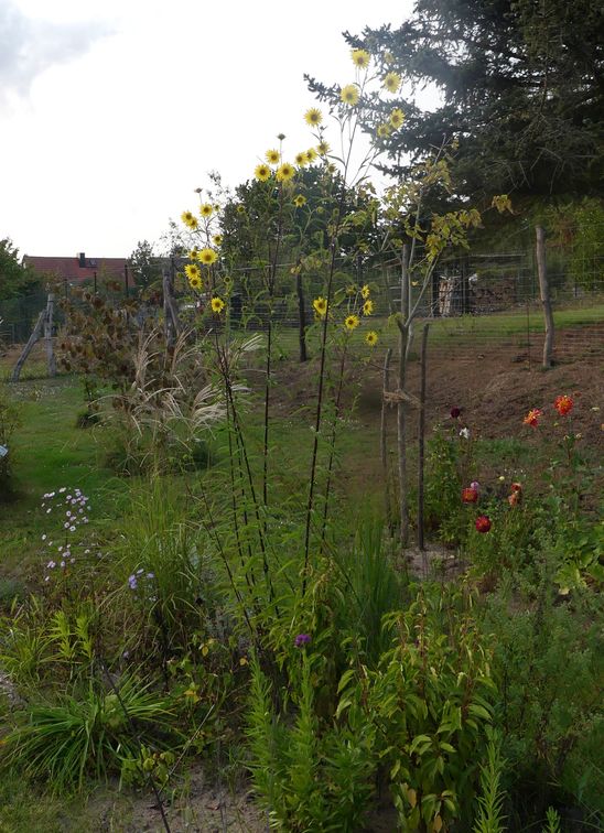 Es ist 'Simon Wiesenthal', eine sehr hohe giganteus-Hybride, die breit lagern würde, wenn ich ihr keine Stützen verpasste. Lässt sich aber willig helfen. Es reichen zwei einfache Stahlbügel