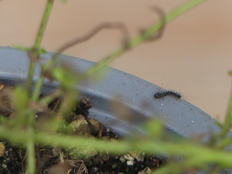 Voriges Wochenende krabbelten lauter winzige Raupen (?) auf der Terrasse herum. Sie kamen offenbar aus einem Topf mit Thymian comosum, der auch ganz abgefressen aussah, nachdem ich ihn problemlos über den Winter bekommen hatte. Ich weiß aber nicht, ob es wirklich die Raupen waren oder ein anderer Fresser.