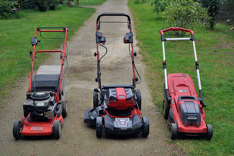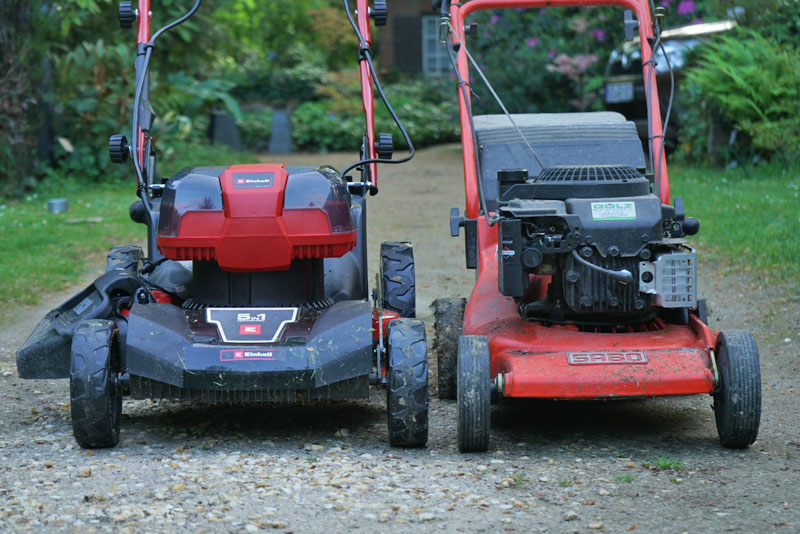 Ergo: ich brauche keinen Benzinmäher mehr, obwohl der (alte!!) Sabo immer noch gut und extrem solide ist. Der Einhell ist ein ziemlicher Brummer und etwa genauso schwer. Dafür nahezu wartungsfrei und schnell ohne Benzinsifferei umgedreht und saubergemacht. Hier die subjektive Ansicht, mit angesetztem Mulcher ist er schon recht breit.