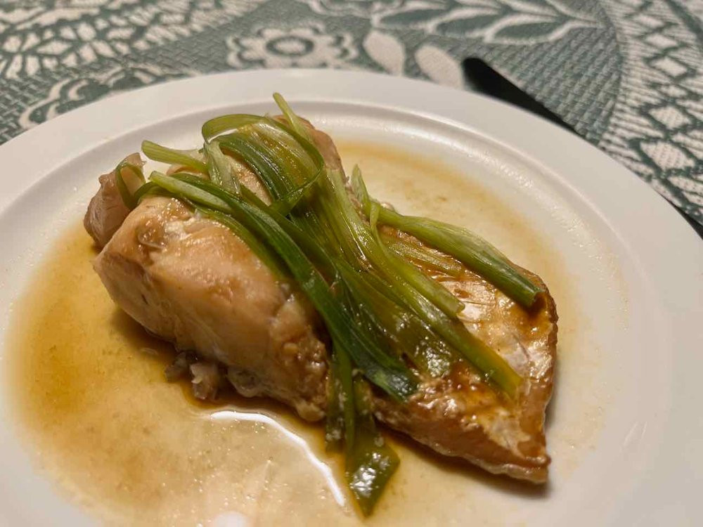 Zanderfilets vom Eriesee, asiatisch mariniert und mit Frühlingszwiebeln über Sherryschorle gedämpft