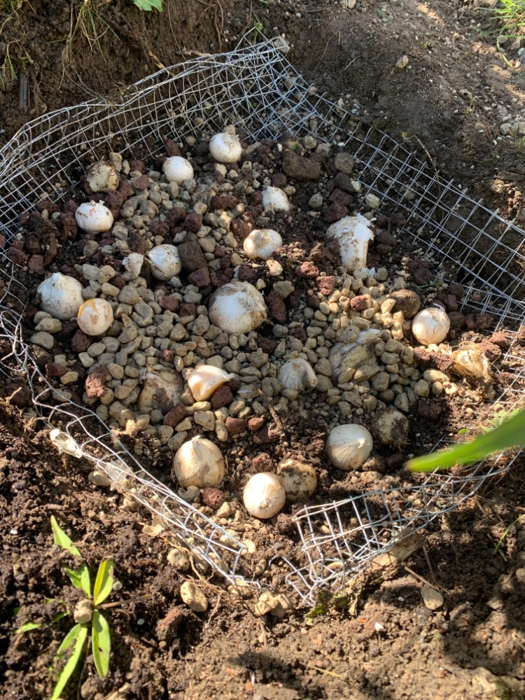 Dann die teuren allium giganteum knollen in die Erde verbracht Boden tief gelockert und mit Sand bims Kies Lava drainert und dann ich ein paar kleinere allium darüber ( siehe Bild), die Knollen von giganteum waren so groß das dir noch eine Schicht tiefer sind