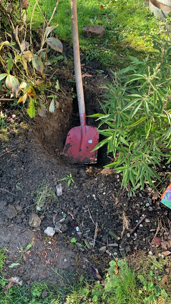 Heute habe ich an neue Beet weitergebuddelt. Weil mir bewusst ist, dass ich für den ganze Fläche ziemlich lange brauchen werde, bereite ich erst Platz für bereits vorhandene Pflanzen vor, danach wird die Pflanze gepflanzt.