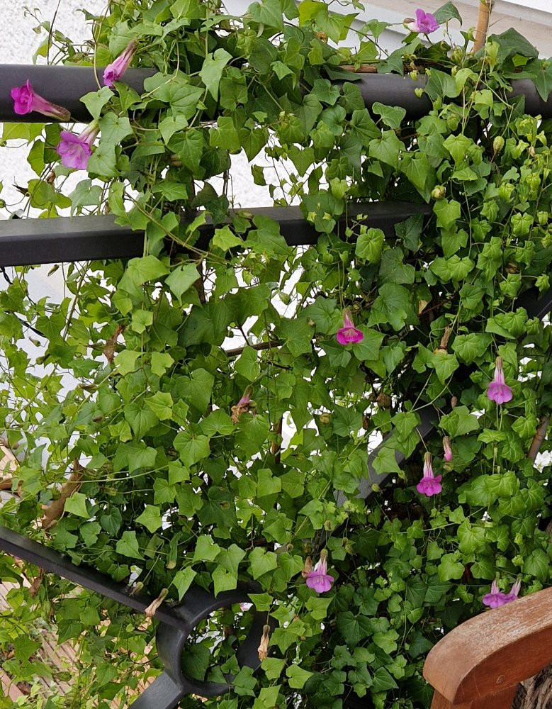 Die Blüten werden zwar weniger, aber Asarina scandens hält an der Hauswand noch länger durch als sonst. Direkt daneben ist die Weihnachtsdeko, hat fast was Mediteranes in Oberbayern