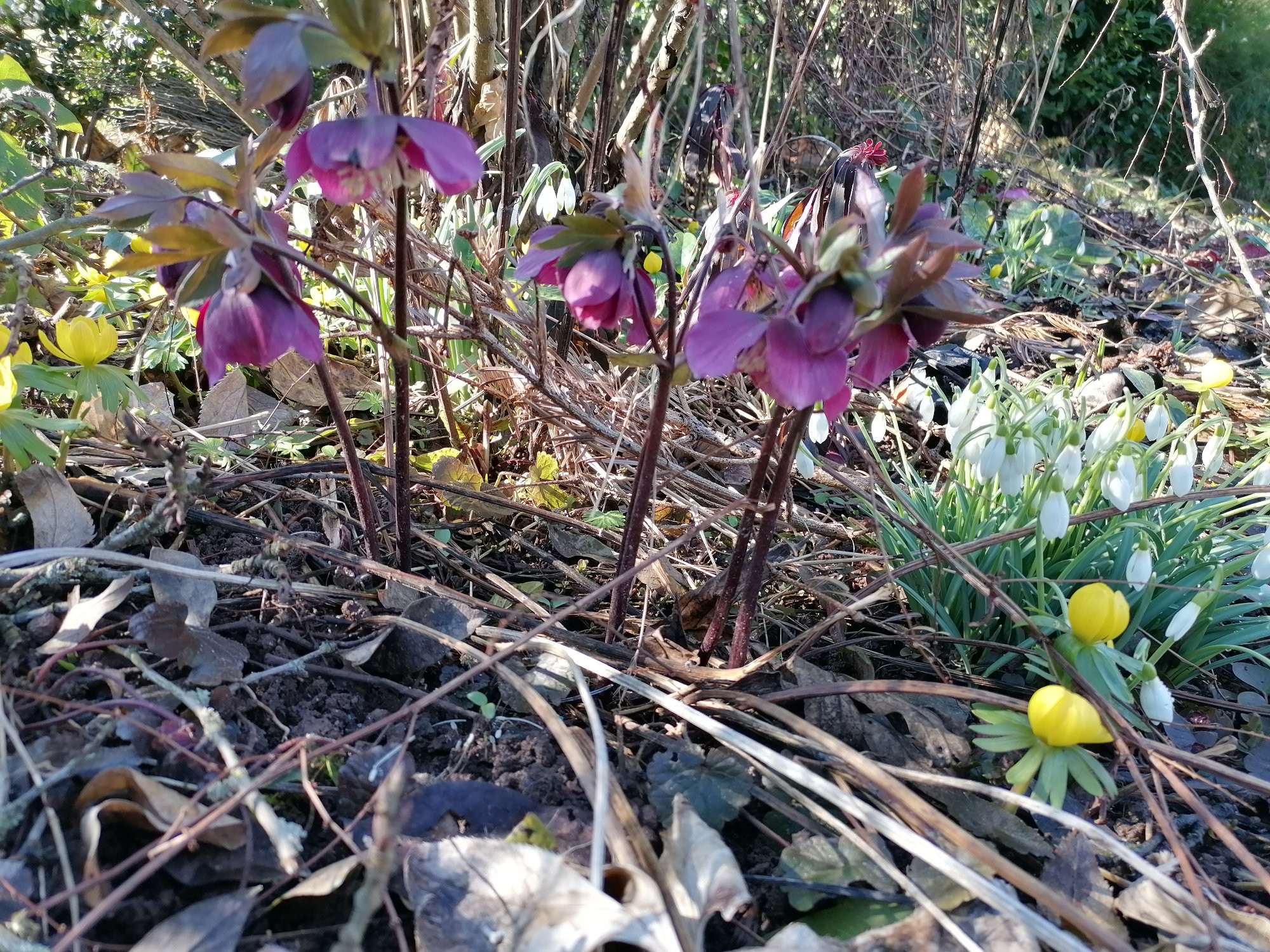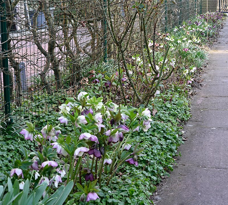 Bei mir gedeihen die Helleborus, in der Einfahrt habe ich grob gezählt, es sind 60-70 blühende Hellis und jede Menge junge Sämlinge. Fotos der gleichen Seite von vorne nach hinten und umgekehrt.