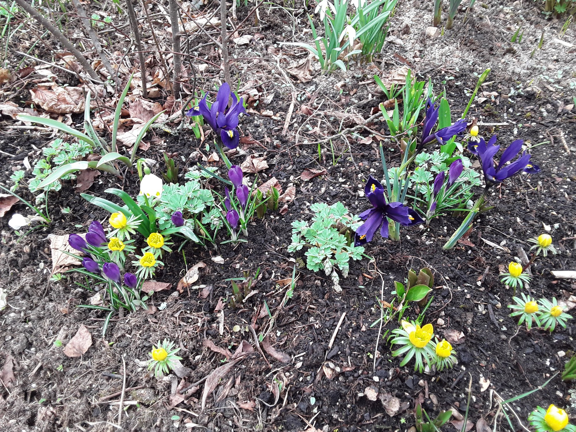 Noch etwas zaghaft blüht mein kleiner Winterschneeball, aber mit den Jahren wird er sicher an Format gewinnen und einem dann wie auch die Zaubernuss eine Duftwolke entgegenschicken. Flankiert wird er von zwei rindenfärbenden Hartriegeln, Bergenien und Carex 'Everillo' sorgen für etwas poppigere Farben im Vordergrund. An den sonnigen Stellen habe ich ein paar robuste Iris gepflanzt (I. pallida, flavescens usw.), und zwischen deren Rhizomen scheinen sich auch die Zwiebeliris recht wohlzufühlen, sie sorgen bereits sehr früh im Jahr für hübsche Farbtupfer.