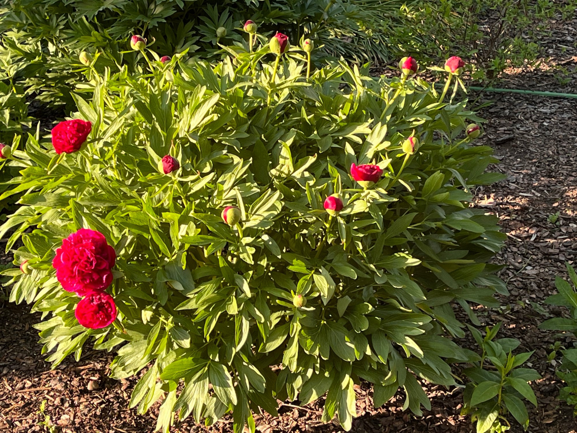 jetzt sind die roten Päonien dran. Die weniger als halb gefüllte Illini Belle und Red Charm sind die ersten.