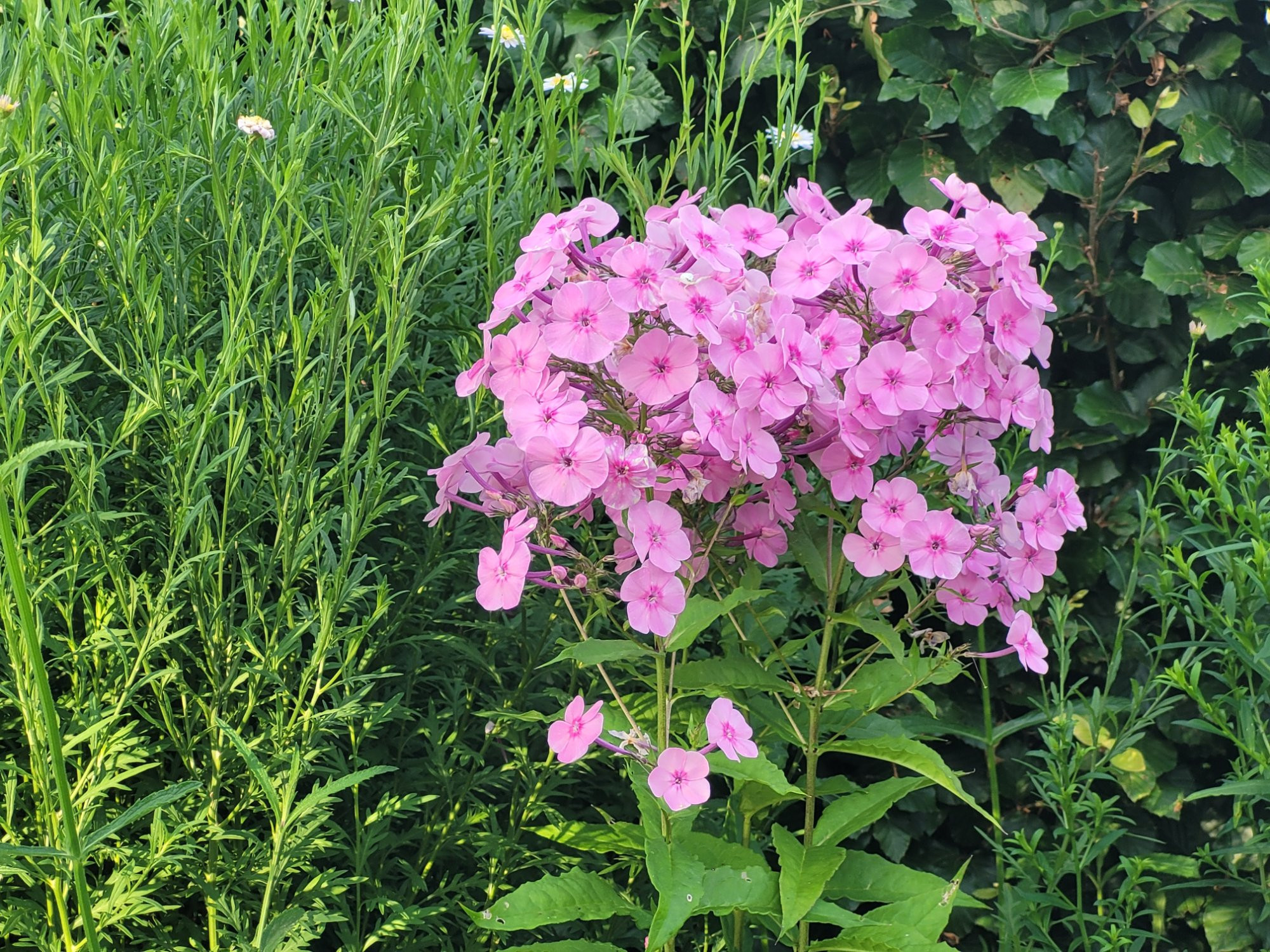 Hier gibt es Phloxe im zweiten und im dritten Standjahr... und allmählich werden die Horste ansehnlicher. Im hiesigen Lehmboden kommen sie recht gut zurecht, auch in halbschattigen Lagen und zum Teil mit Wurzeldruck. Ich hätte so gerne Delphinium angesiedelt. Das wird hier nichts. Aber Phloxe blühen. Bei Trockenheit muss ich dann eben gießen.
