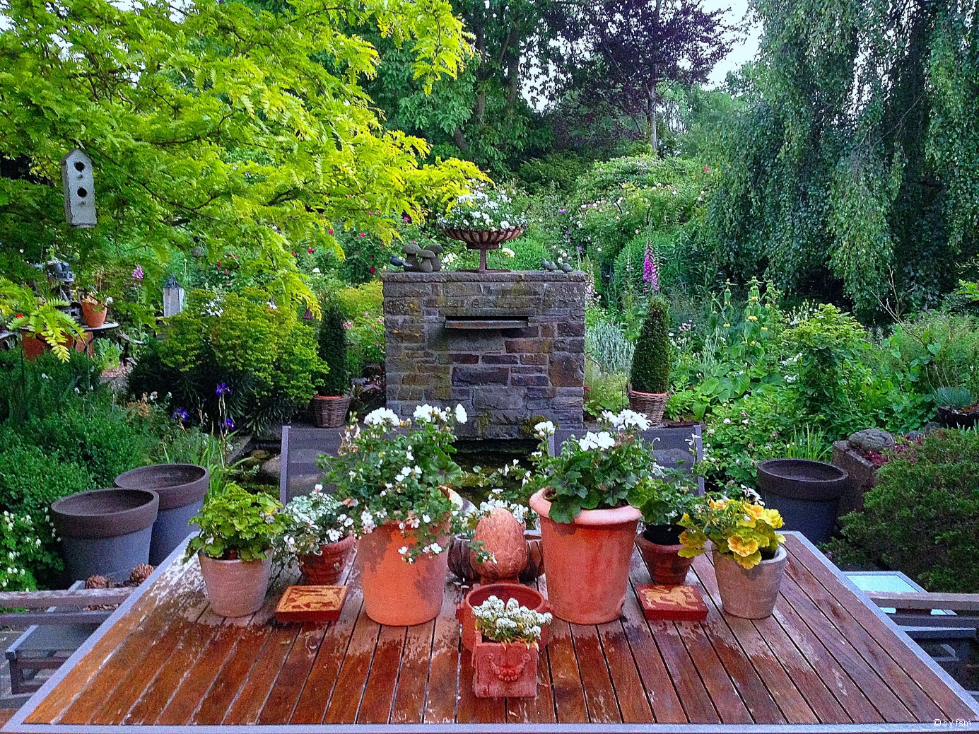 Das finde ich auch - einfach wundervoll. Schade, dass HPM nur einmal blüht...!Hier vor dem großen Regen der Blick vom anderen Sitzplatz und den letzten unbepflanzten Töpfen - ich warte auf Bingerden und die Plectranthas...!Hier kann man auch mehr als eine Kaffeetasse abstellen...!LG FrankSandfrauchen, dein Garten ist wirklich eine Pracht!Und die P.H.M. ist wirklich eine Wucht!!!