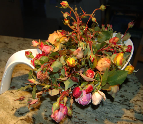 Och, sind das schöne Rosenbilder. Da wird es einem gleich wieder warm im Herz. Bei nächtlichen Minusgraden bis 5, bin ich heute durch den Garten gegangen und habe schweren Herzens, bei herrlichem Sonnenschein alle noch knopenden Rosen abgeschnitten . Erfrieren müssen sie mir ja auch nicht, dann nehme ich sie doch lieber rein.Die Schüssel ist etwa 30 cm lang und 20 cm breit.Ein ganzes Potpourri, mal sehen ob es einige noch schaffen aufzugehen:
