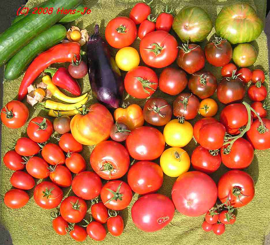 Hallo,nachdem ich in den letzten Tagen nur mit Ernte und Verarbeitung beschäftigt war, habe ich mich heute mal aufgerafft und einen Teil der heutigen Ernte abgelichtet. Eineige Cocktail- und Kirschtomaten mussten draussen bleiben....Viele Grüße aus Rusbend,Hans-Jo