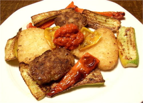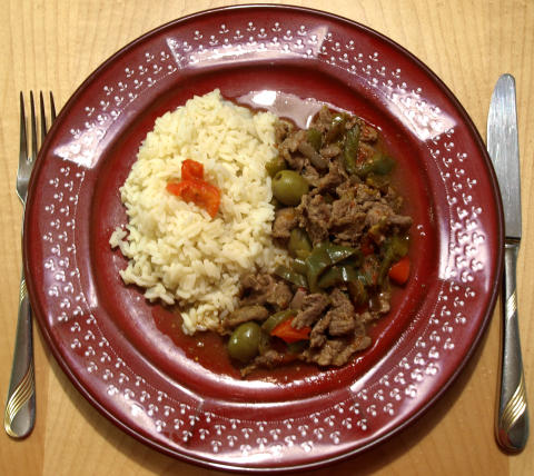 heute gab es Rindsgeschnetzeltes mediterrane Art mit Peperoni und Tomaten aus dem Garten und Oliven aus der Tüte und Reis