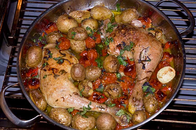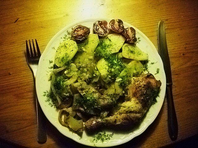 Ninas Essen vom Montag hatte mir extrem gut gefallen, deshalb gab es heute: Hähnchenschenkel, Kartoffeln, Tomaten, Paprika, Zwiebeln, Knoblauch, Rosmarin, Basilikum und Olivenöl :P Beim nächsten Mal brauche ich eine größere Pfanne