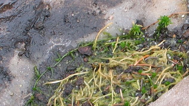 Eine meiner etwa eine Woche alten Moosansalbungen auf Polyester, etwas mehr als Daumennagel groß.