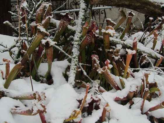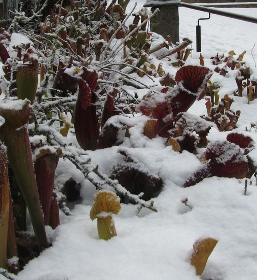 Axel, da sagst Du was!Ich hatte mir letztes Jahr eine Darlingtonia californica gekauft. Sie saß im Topf in einem Sphagnumpolster und so pflanzte ich sie in mein Moorbeet.Sie hat den Winter gut überstanden. Ich hatte allerdings meinen Drahtkäfig (Schutz gegen Amseln) stehen lassen, der im Winter mit einer Schneeschicht bedeckt war. Es gab aber dann glaublich im Februar (?) starken Kahlfrost, den die Pflanze auch überstanden hat. Es wird wohl am Sphagnumpolster liegen.