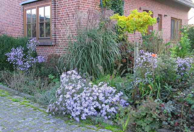 Astern prägen das Bild in der Einfahrt.Hinten Aster 'Pink Star', vorne A. pyrenaeus 'Lutetia' und rechts Aster 'Combe Fishacre' mit der verirrten Papaverblüte.